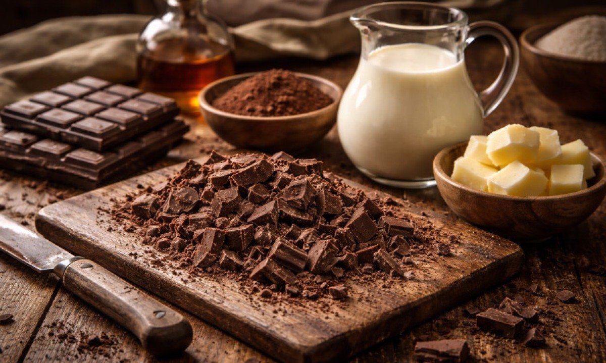 A receita tradicional leva apenas dois ingredientes, mas o resultado depende da qualidade de ambos. Um bom chocolate e um creme de leite adequado fazem toda a diferença.