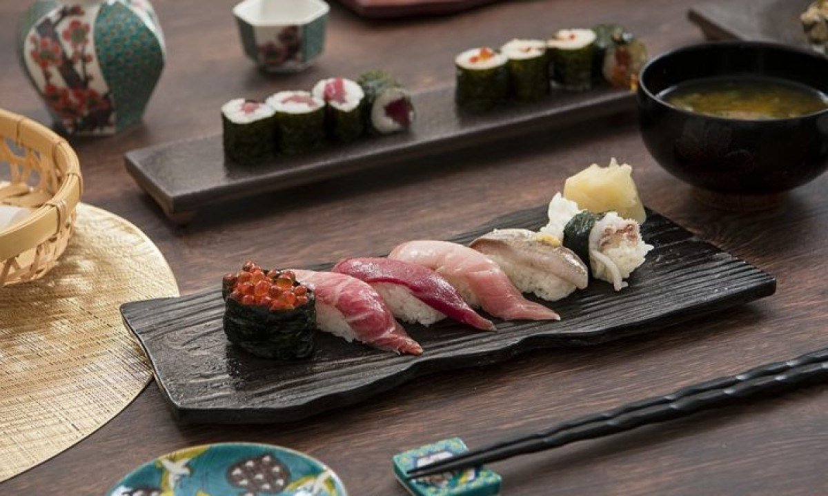 Sushi: Bolinho de arroz temperado com vinagre e recheado com peixe cru, frutos do mar ou outros ingredientes. Pode ser enrolado em alga marinha (maki) ou moldado à mão (niguiri).