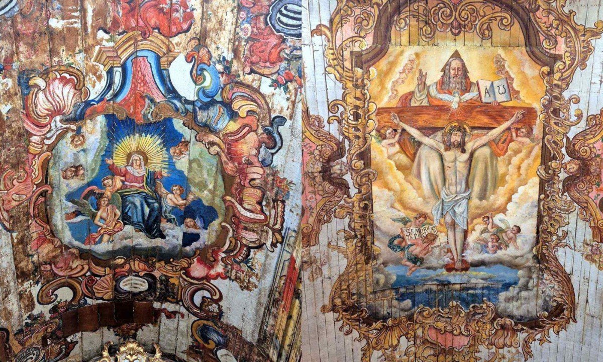 No forro da capela Nossa Senhora do Pilar, em Sabará, a Santíssima Trindade, com Deus Pai, Divino Espírito Santo e Cristo crucificado, e a assunção de Nossa senhora Foto: jair amaral/em/d.a press