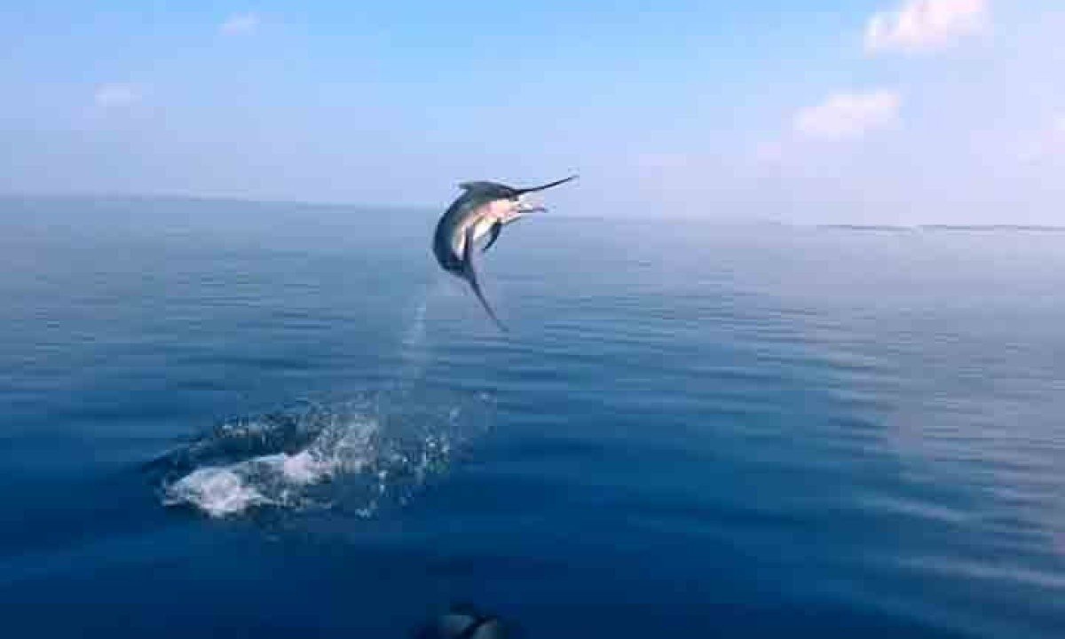 Sua enorme nadadeira dorsal lembrando uma vela reduz o atrito durante arrancadas, e o corpo esguio funciona como uma verdadeira lâmina. Ele usa o bico alongado para cortar cardumes e capturar presas com precisão impressionante. Foto: Reprodução do X @Jamesrus42 -