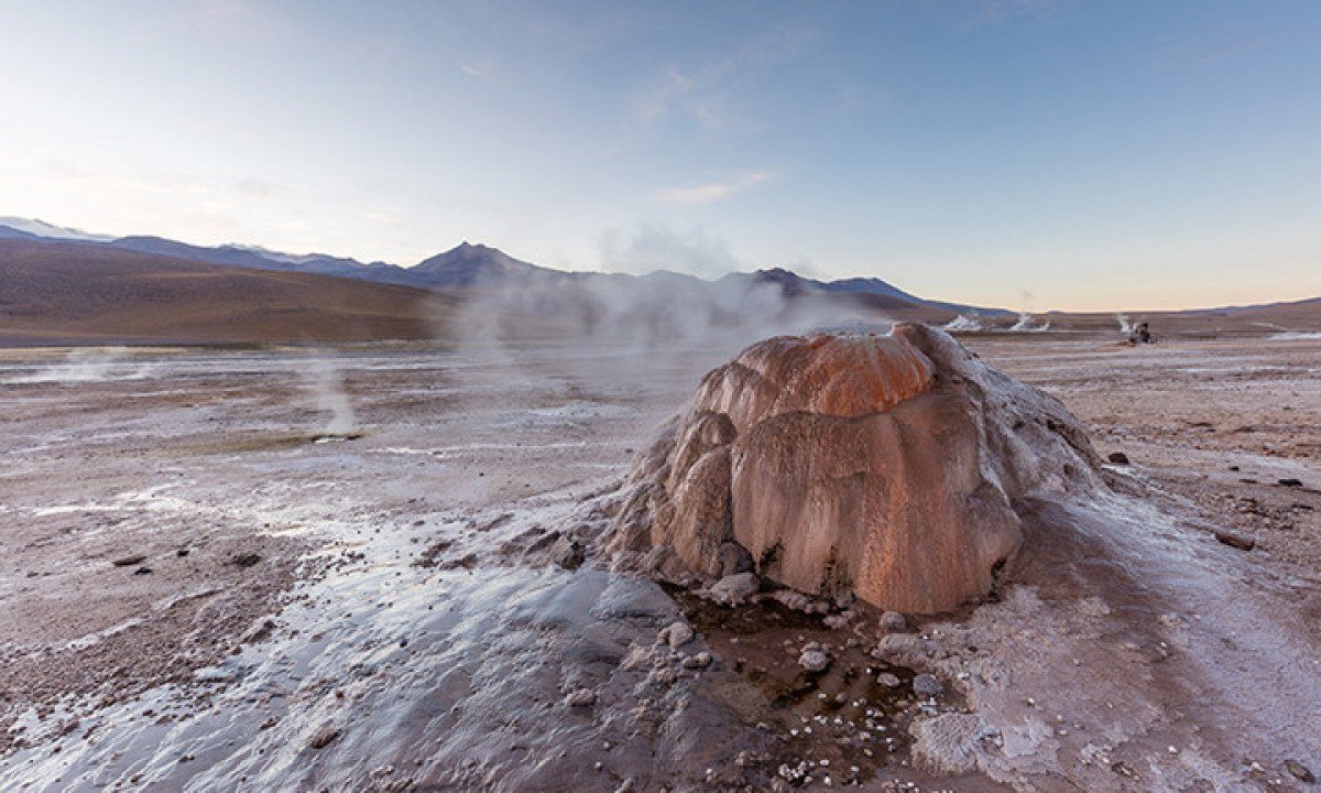 Em San Pedro de Atacama, no Chile, El Tatio é o campo de gêiseres mais alto do mundo. Situado a cerca de 4.300 a 4.320 metros acima do nível do mar. É também o maior campo geotérmico do Hemisfério Sul, famoso por suas erupções ao amanhecer, quando o frio intenso contrasta com colunas de vapor que emergem do solo e criam um espetáculo visual único nas montanhas andinas. Foto: Diego Delso wikimedia commons -