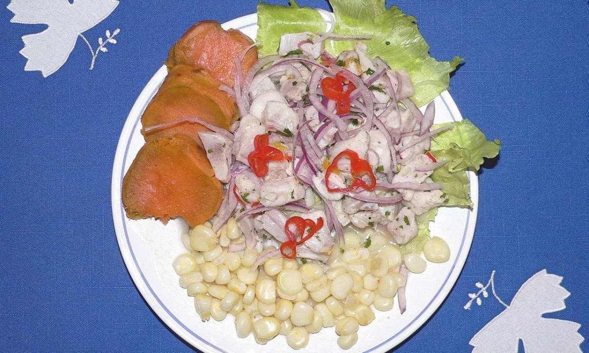 O ceviche é tradicionalmente servido com milho, batata-doce e alface, criando contraste de sabores e texturas. Esses acompanhamentos equilibram a acidez do prato e reforçam sua ligação com ingredientes locais. A combinação transforma o ceviche em refeição completa. Foto: Lechatjaune wikimedia commons -