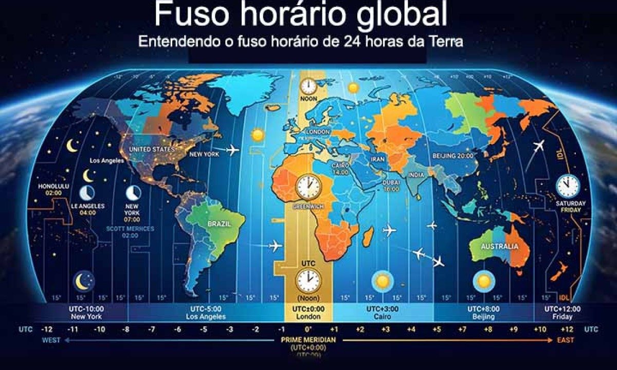 Para determinar o fuso horário de uma região, é necessário conhecer sua longitude em relação a Greenwich. Se a localidade está a leste, soma-se horas; se está a oeste, subtrai-se. Essa lógica simples permite calcular o horário em qualquer parte do mundo, considerando que cada 15 graus de longitude equivalem a uma hora de diferença. Foto: Reprodução de Rede Social -