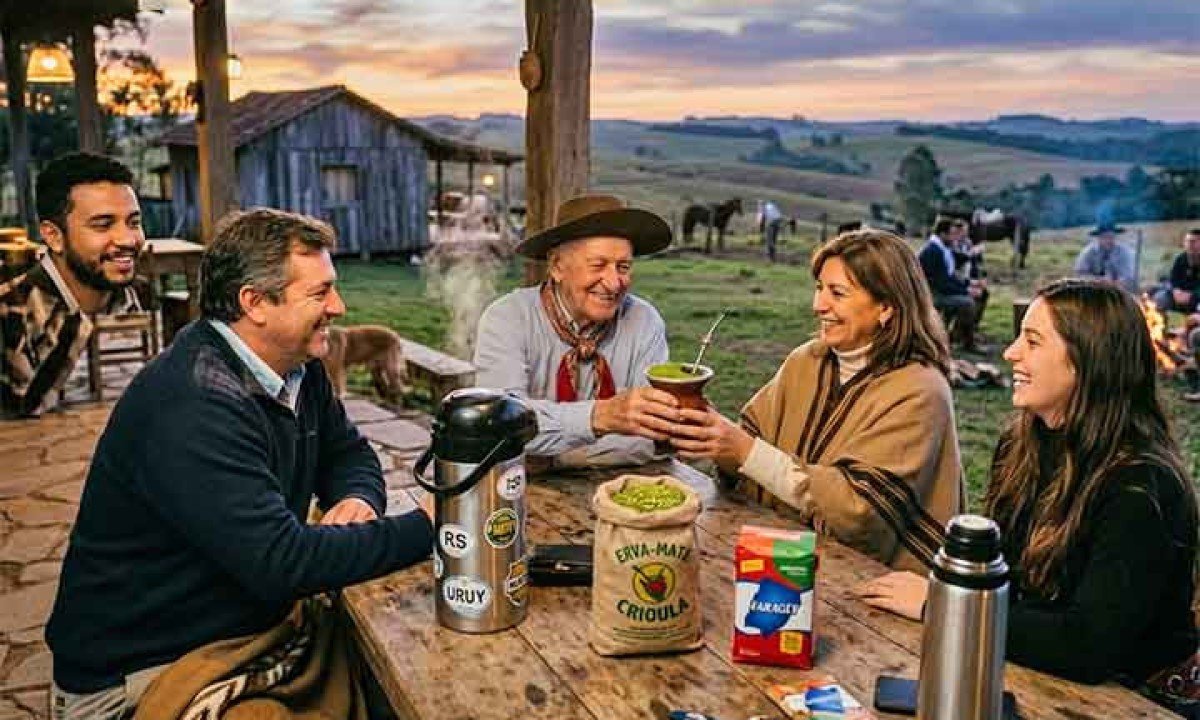 O chimarrão é símbolo da cultura do Rio Grande do Sul e de regiões vizinhas, reforçando pertencimento e orgulho local. Ele está presente em festas, tradições e celebrações, marcando a memória coletiva. Pesquisas mostram que cerca de 75% das famílias do Sul consomem mate regularmente, evidenciando sua força cultural. Foto: Imagem gerada por Inteligência Artificial -