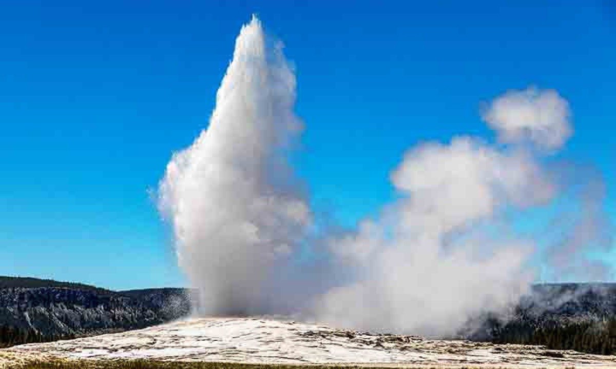 O Old Faithful (o "Velho Confiável") entra em erupção cerca de 20 vezes por dia, o que o torna altamente previsível. Com precisão de 90%, os cientistas conseguem antever a próxima explosão com margem de erro de apenas 10 minutos. Essa regularidade é rara entre gêiseres, o que reforça sua fama mundial. Para os turistas, essa previsibilidade garante que quase todos consigam assistir ao espetáculo natural. Foto: Divulgação -