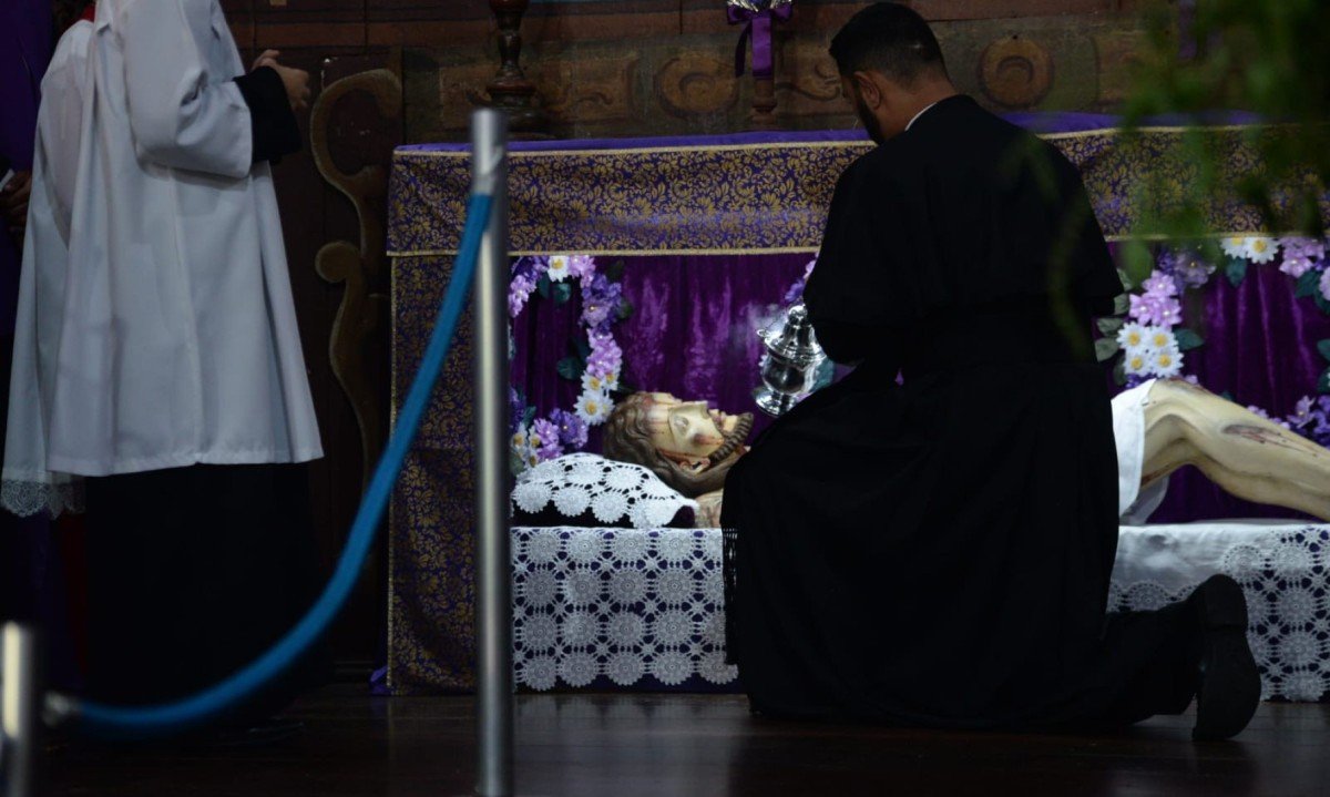 Ao se ajoelhar diante do esquife de Jesus, para uma breve oração ou tocar a imagem, o fiel mantém um velho costume: trocar uma moedinha por outra Foto: Túlio Santos/EM/D.A Press -