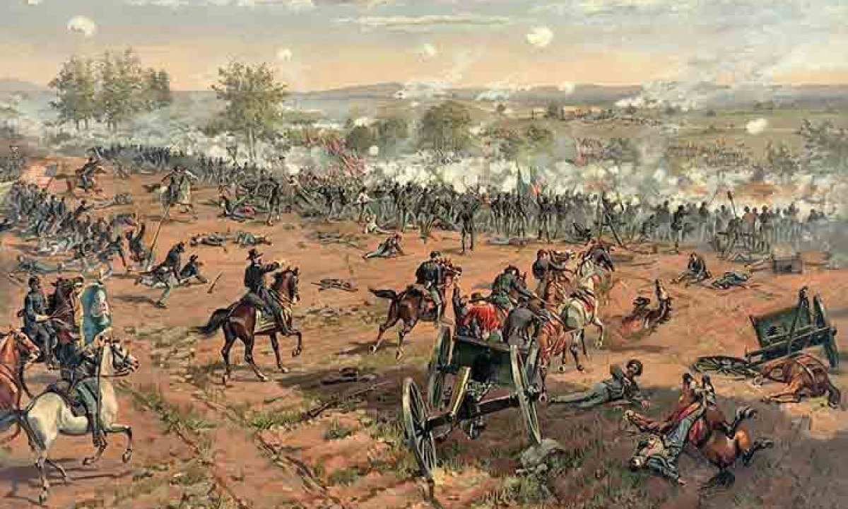 A Batalha de Gettysburg teve 170 mil soldados e provocou mais de 50 mil baixas, com derrota dos confederados. A União possuía estrutura bélica superior, graças à industrialização do norte dos Estados Unidos à época. Foto: Domínio Público/Wikimédia Commons -