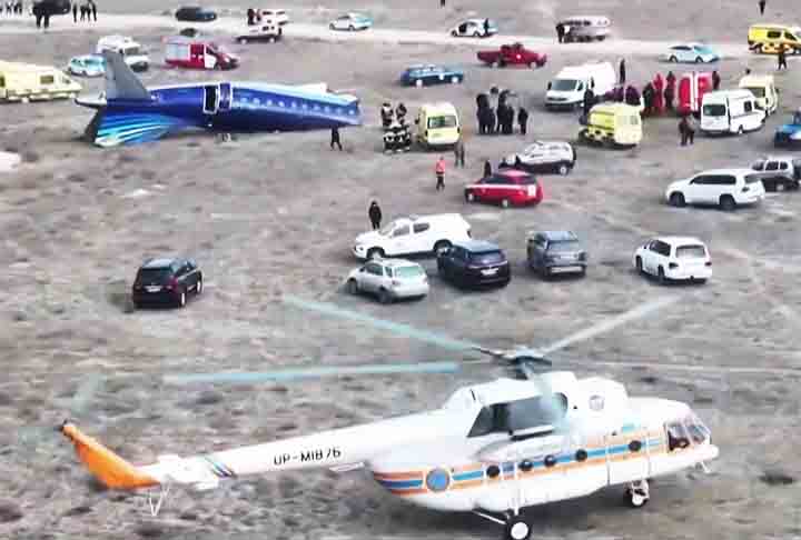 O Kremlin informou que a Rússia instaurou investigação para apurar as causas do acidente. Cazaquistão e Azerbaijão também investigam a queda da aeronave. Foto: Reprodução de Youtube Canal AFP Português -