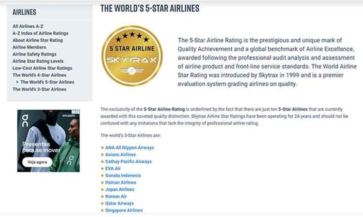A Singapore Airlines, que era a primeira, foi ultrapassada pela Qatar Airways e agora está em vice. Fundada em 1972, tendo origem na Malayan Airways, de 1947). Sediada na cidade de Singapura, em Singapura. Tem 159 aviões na frota. Foto: Divulgação Singapore Airlines -