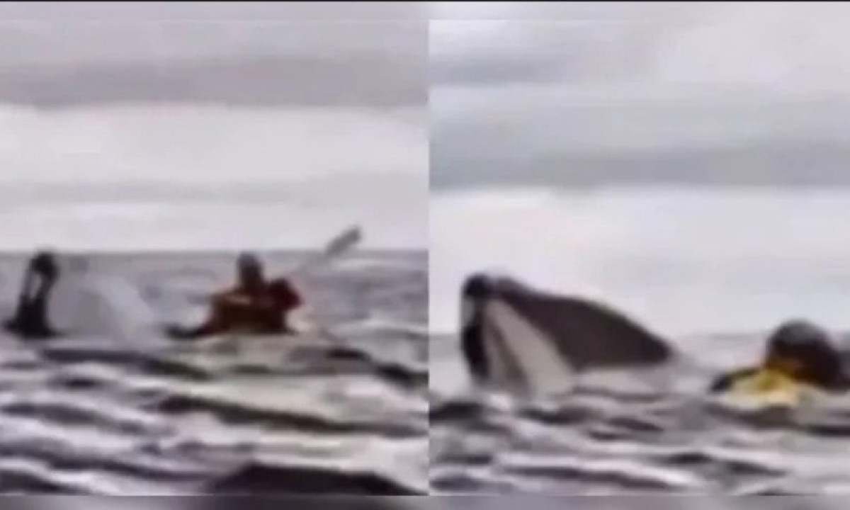Adrián declarou: "Senti uma textura viscosa, que roçou meu rosto. Fechei os olhos esperando um impacto, mas a sensação foi como se ela estivesse me virando, não me golpeando, e fiquei deitado. Percebi que ela não havia me comido, que não era um predador" , disse, acrescantando que, para ele, a baleia poderia estar curiosa com a presença dos homens e querendo "brincar". Foto: Reprodução de vídeo redes sociais -