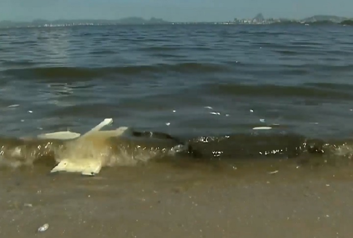 O descarte inadequado de resíduos e o transporte marítimo são fatores determinantes para esse fenômeno, com a poluição das praias ainda sendo um dos maiores agravantes para as condições da Baía de Guanabara. Foto: reprodução/tv record -
