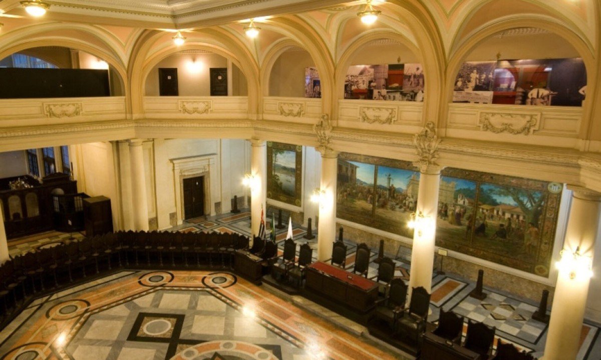 O Museu do Café tem como destaque o acervo do salão do pregão. Ele é composto por uma mesa principal e setenta cadeiras, onde eram realizadas as negociações que determinavam as cotações diárias das sacas de café. Foto: Divulgação Portal Museu do Café -