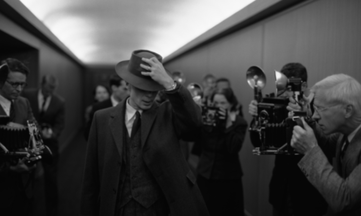 Numa cena ambientada em 1945, J. Robert Oppenheimer (interpretado por Cillian Murphy, Oscar de Melhor Ator) está no meio de uma multidão que agita bandeiras americanas. Mas há um porém. Foto: Divulgação/Universal Pictures -