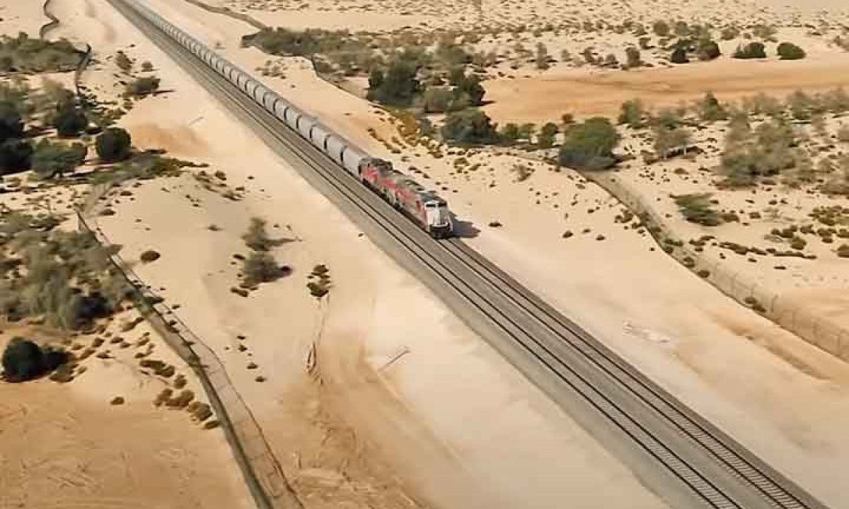 A ferrovia vai além de ser uma conquista na engenharia; é também um projeto estratégico para solidificar as economias do Golfo. Foto: Youtube Canal Construction Time -