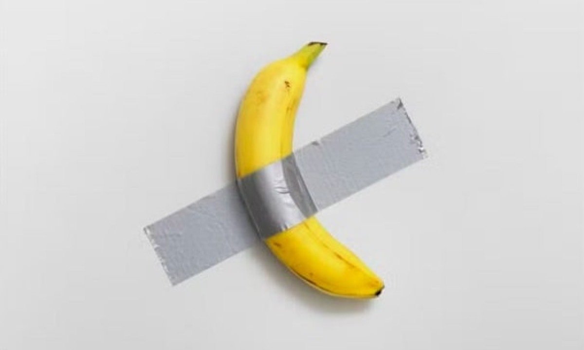 Batizada de "Comedian", a polêmica obra foi criada pelo artista italiano Maurizio Cattelan em 2019. Ela foi exposta originalmente no Art Basel, em Miami, e viralizou nas redes sociais por sua aparente simplicidade. Foto: montagem/reprodução Sotheby's -