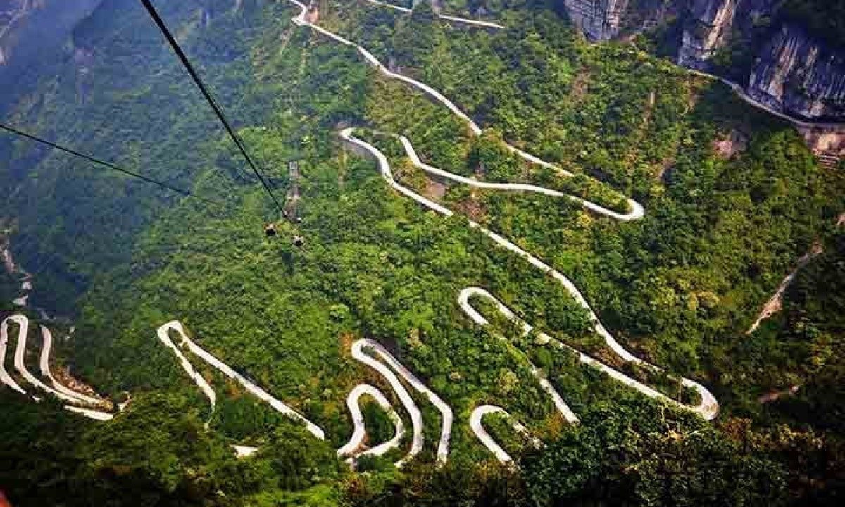 A Estrada da Montanha Tianmen foi construída entre 1998 e 2005. De cima, há quem diga que ela parece serpentear as encostas como um dragão. Foto: Flickr Andrii Zymohliad -