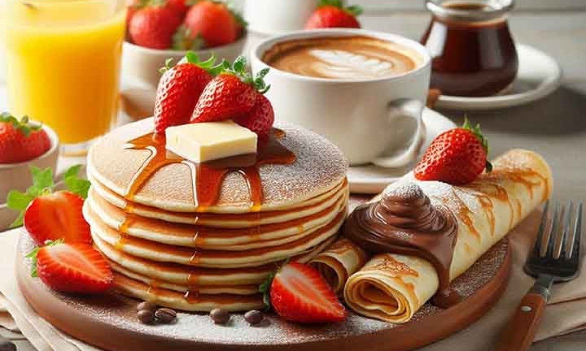 A diferença entre panqueca e crepe está principalmente na textura, espessura e ingredientes da massa, além do modo de preparo. Veja só. Foto: Imagem gerada por Inteligência artificial através do aplicativo Microsoft Designer -