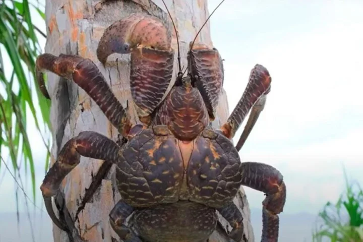 Com suas poderosas pinças, ele quebra os cocos para consumir a polpa. Foto: Reprodução/YouTube -