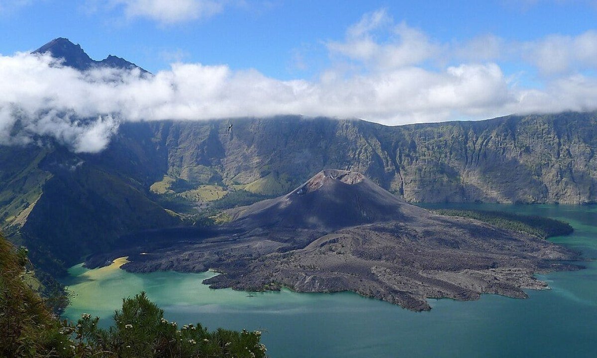 No interior do lago, o cone vulcânico chamado "Gunung Barujari" continua ativo até os dias de hoje. Foto: Wikimedia Commons/Yon Ilahi -