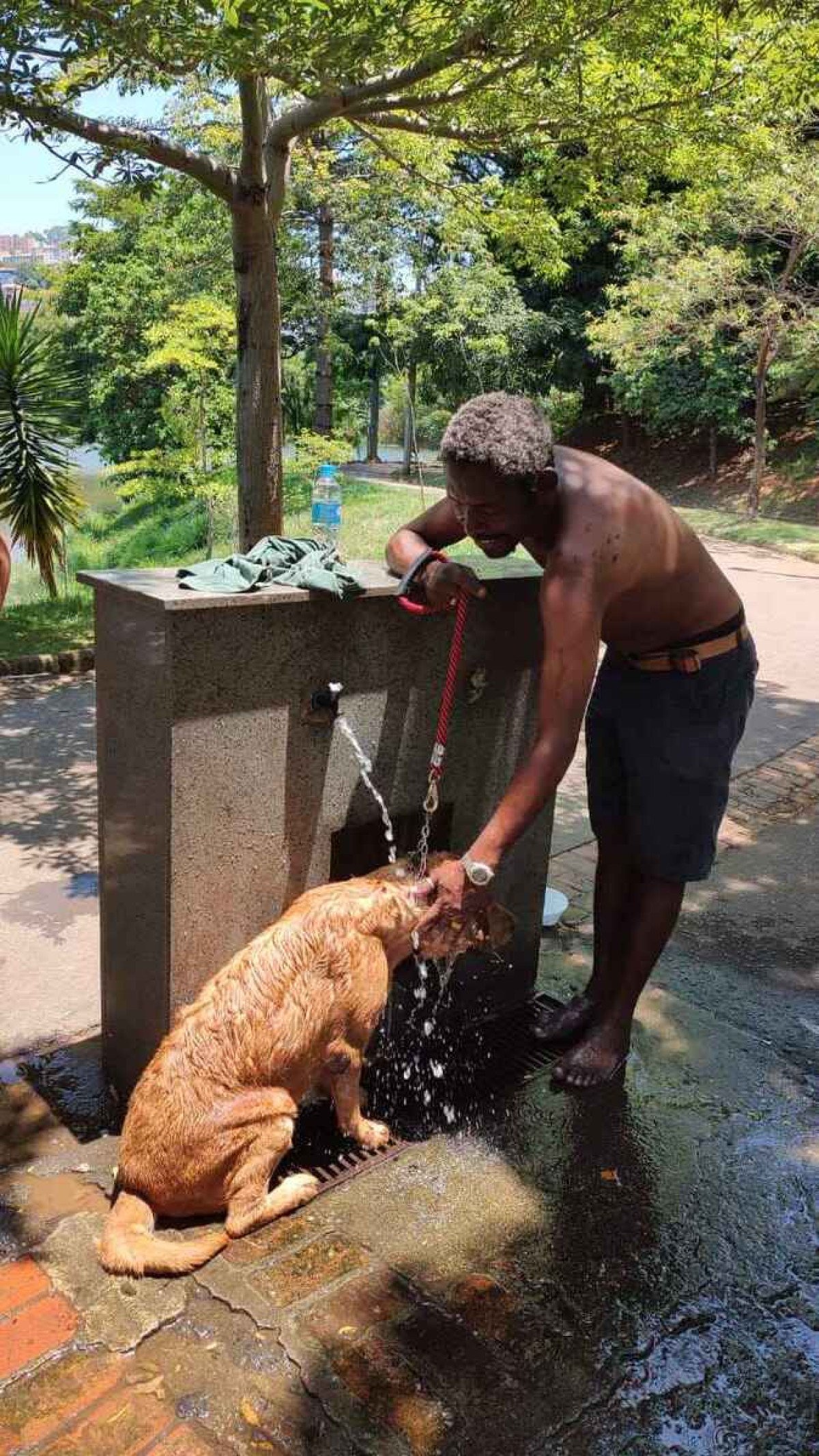 Já o segurança Bruno Alves foi flagrado aproveitando a torneira, não para se refrescar, mas para aliviar seu companheiro de quatro patas. O cachorro labrador Dick Vigarista, nome em alusão ao clássico personagem de desenho animado, tomou banho e pareceu gostar do alívio do calor. “É importante refrescar, mas um detalhe importante também é hidratar. Pelo que temos visto nos últimos anos, a tendência é só piorar. Com a umidade do ar muito baixa, é necessário se hidratar muito, inclusive os pets que a gente tem em casa. ”, ressaltou.