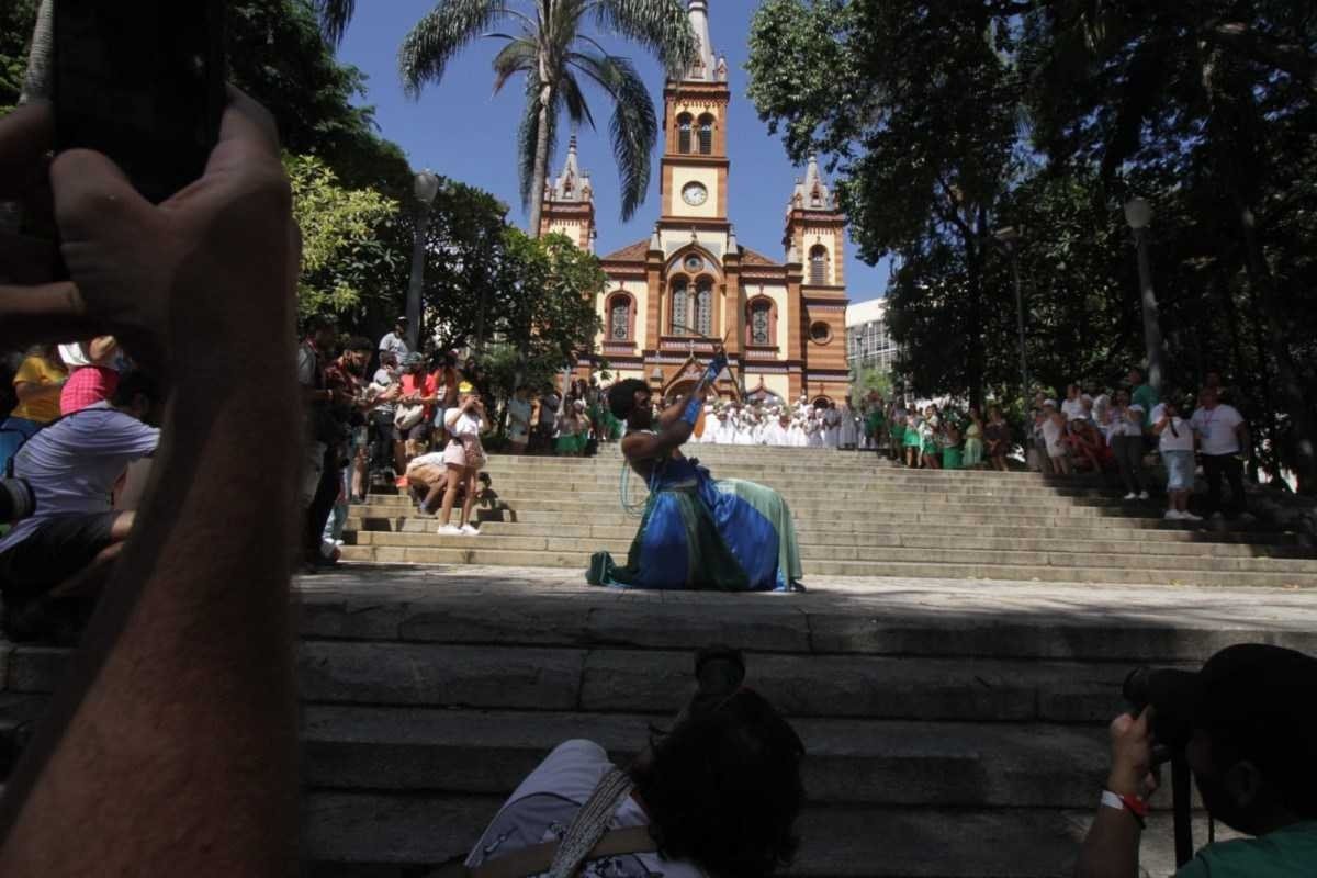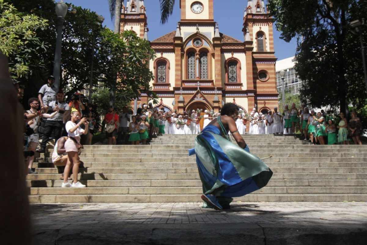 Bloco que une Minas Gerais e Bahia, o Baianas Ozadas iniciou o seu desfile na Avenida Afonso Pena, altura do Centro de Belo Horizonte, na manhã desta segunda-feira (12/2). Neste ano, o grupo homenageia o Ara Ketu, bloco afro de Salvador (BA), o orixá Oxóssi e a mãe Stella de Oxóssi. O cortejo atrai pessoas de todas as idades.