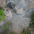 Onde antes havia vegetação, hoje se abrem profundos buracos inundados de água avermelhada, com as chamadas balsas ou dragas que sugam montanhas de entulho em busca das finíssimas e valiosas partículas.