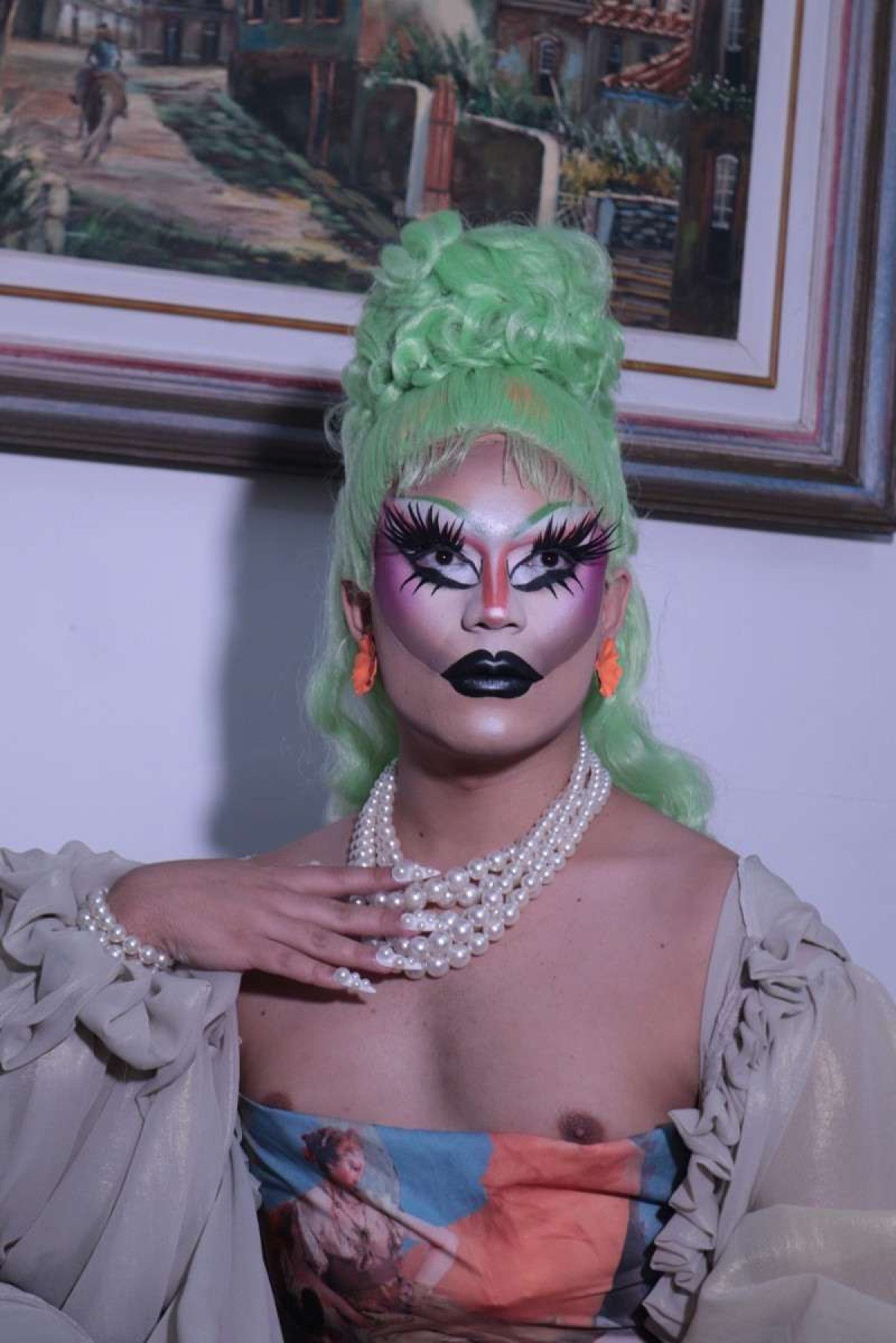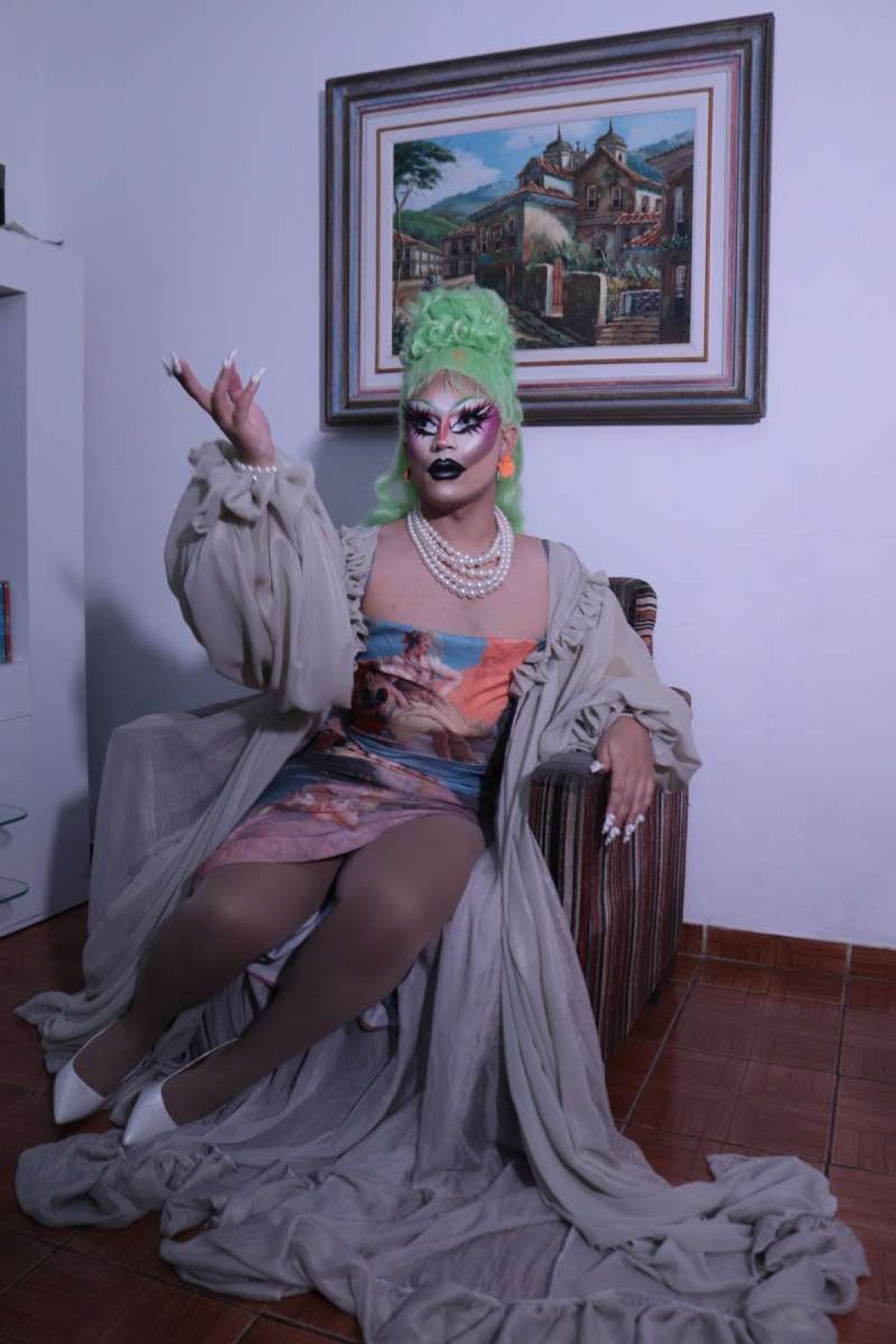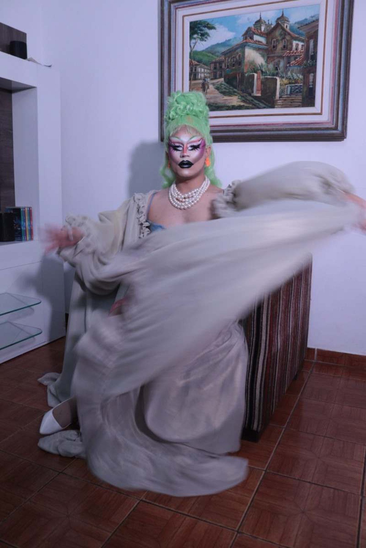 Mesmo nesse lugar de conforto, Aquarela passou a se cobrar demais para se encaixar na cena drag. Foi então que veio a pandemia. Confinada, Aquarela começou a fazer experimentações ali, dentro de seu quarto. “Comecei a explorar minha criatividade e cheguei nisso aqui”, disse, apontando para si mesma, orgulhosa de si.