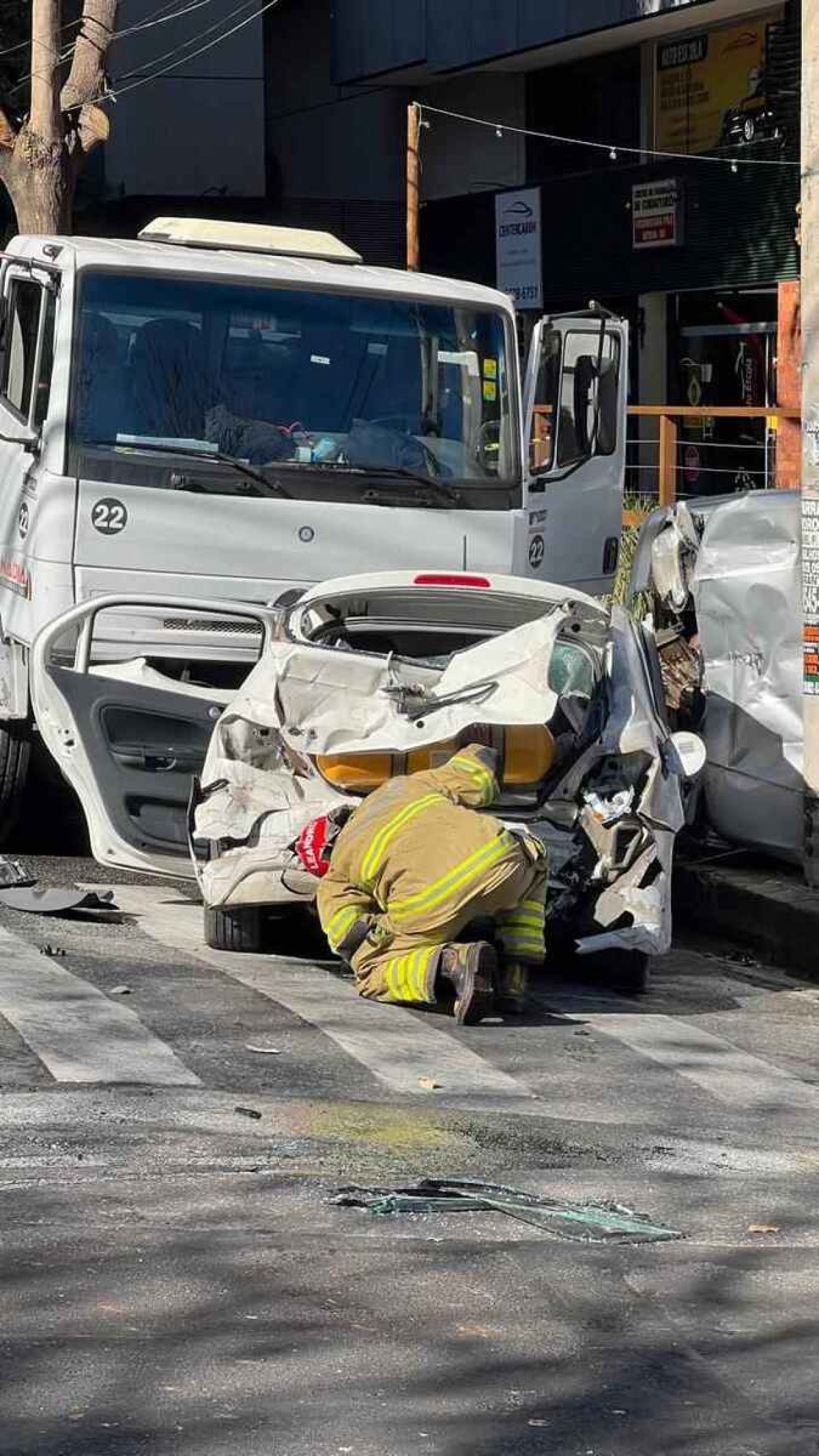 Antes de arrastar os três carros, o caminhão ainda atingiu uma caminhonete. Um dos carros foi parar embaixo do caminhão.