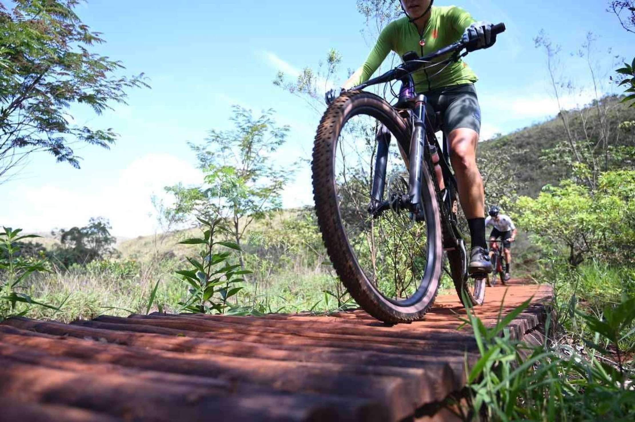 Em frente na Trilha do Cerrado, uma bifurcação separa o trajeto para pessoas a pé e o usado por praticantes de mountain bike – neste segundo, há algumas plataformas em meio à descida para que os praticantes possam dar saltos mais “radicais” com as bicicletas.