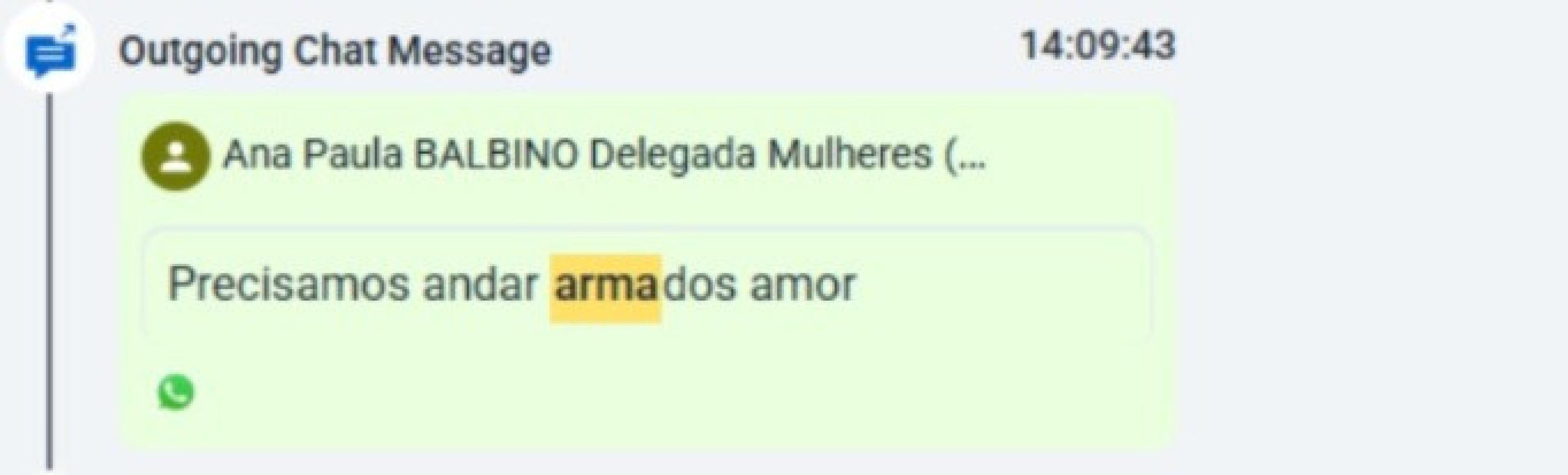 A PCMG revelou que outras ocasiões ilustram que Renê utilizava as armas da delegada e que ela tinha ciência. Entre elas, em 19 de março, ele estava indo buscar Ana Paula, e ela perguntou se podia levar uma colega até o carro para ele conhecer — ao que adicionou: “Só esconde a arma rs”.