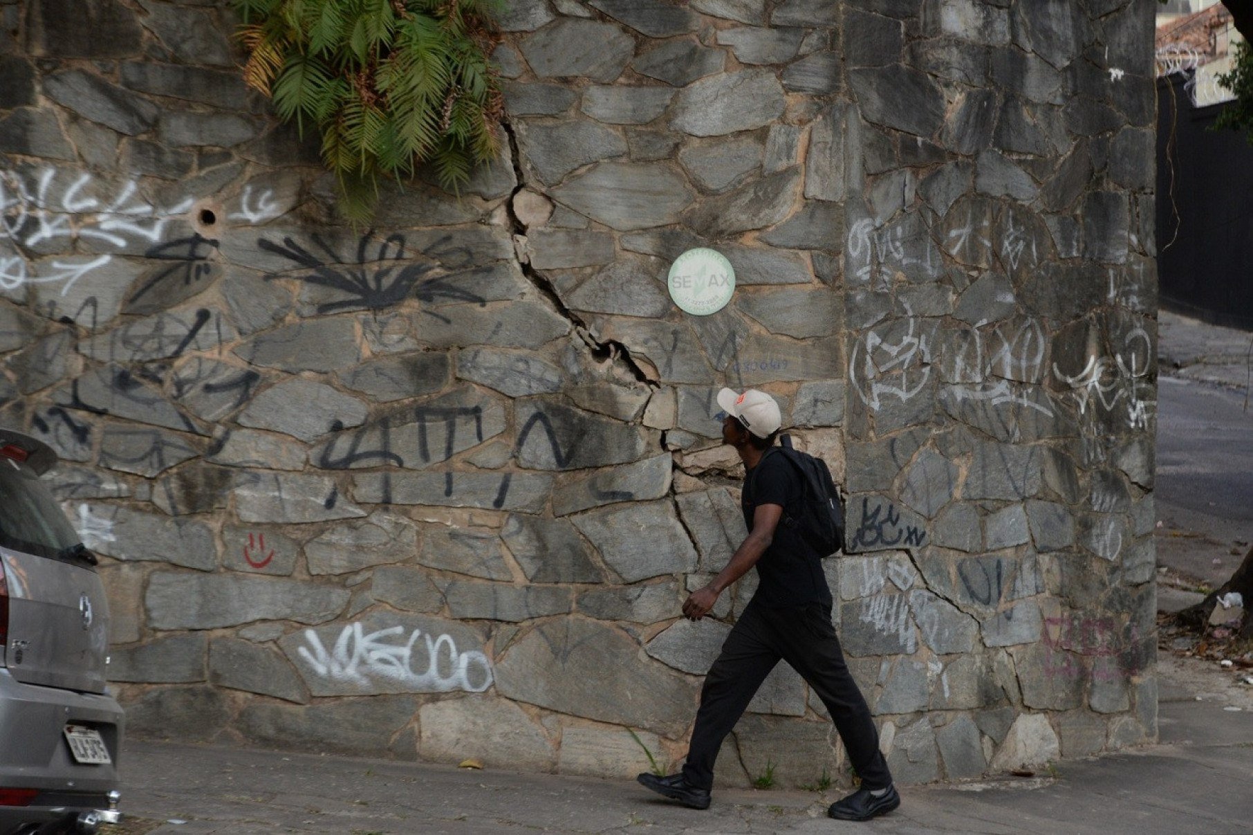 Pedestres e motoristas que passam pela Rua Pium-í, na altura do cruzamento com a Rua Ouro Fino, no Bairro Cruzeiro, Região Centro-Sul de Belo Horizonte, se deparam com uma cena preocupante: um muro de arrimo com uma enorme rachadura. A trinca, que corta a estrutura em sentido diagonal, gera temores de desabamento.