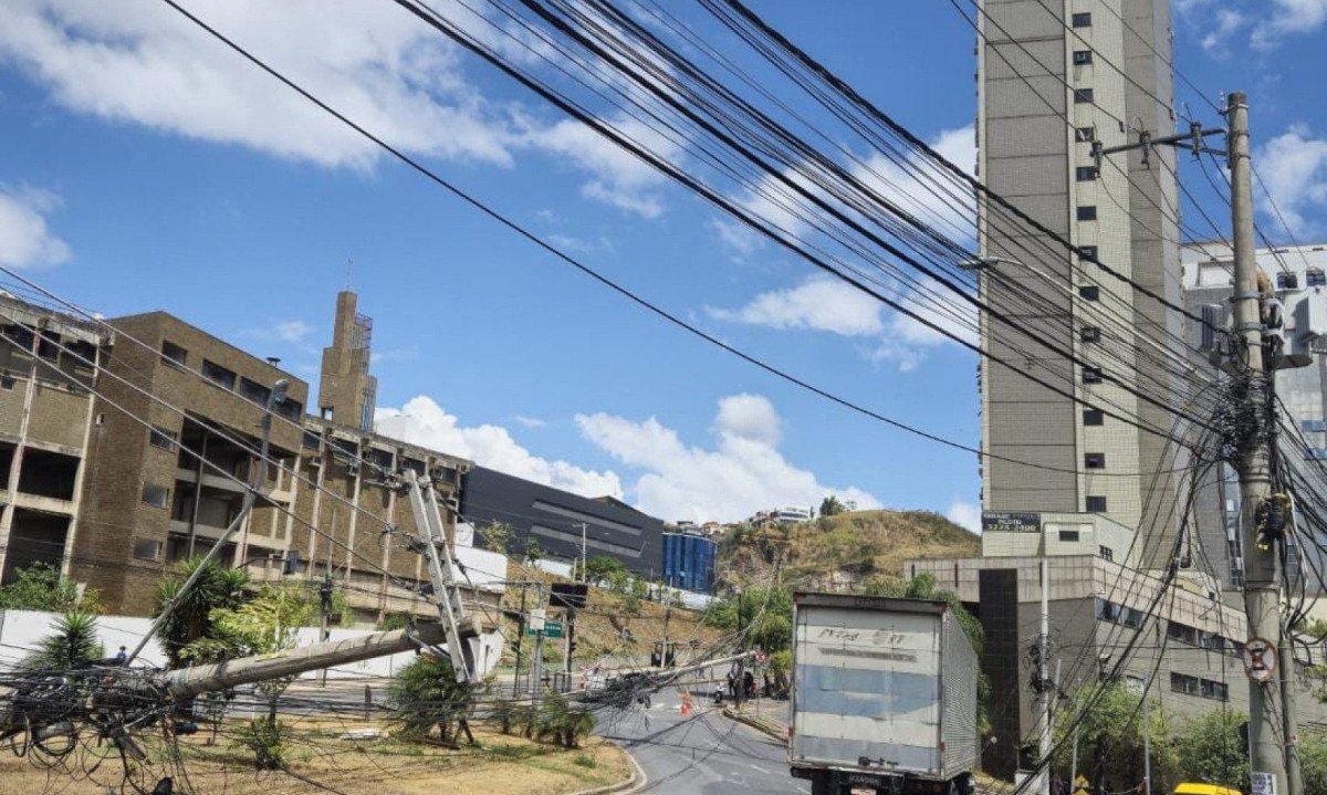 Uma carreta derrubou três postes ao puxar a fiação de avenida no bairro Estoril, na Região Oeste de Belo Horizonte (MG), que está sem energia.