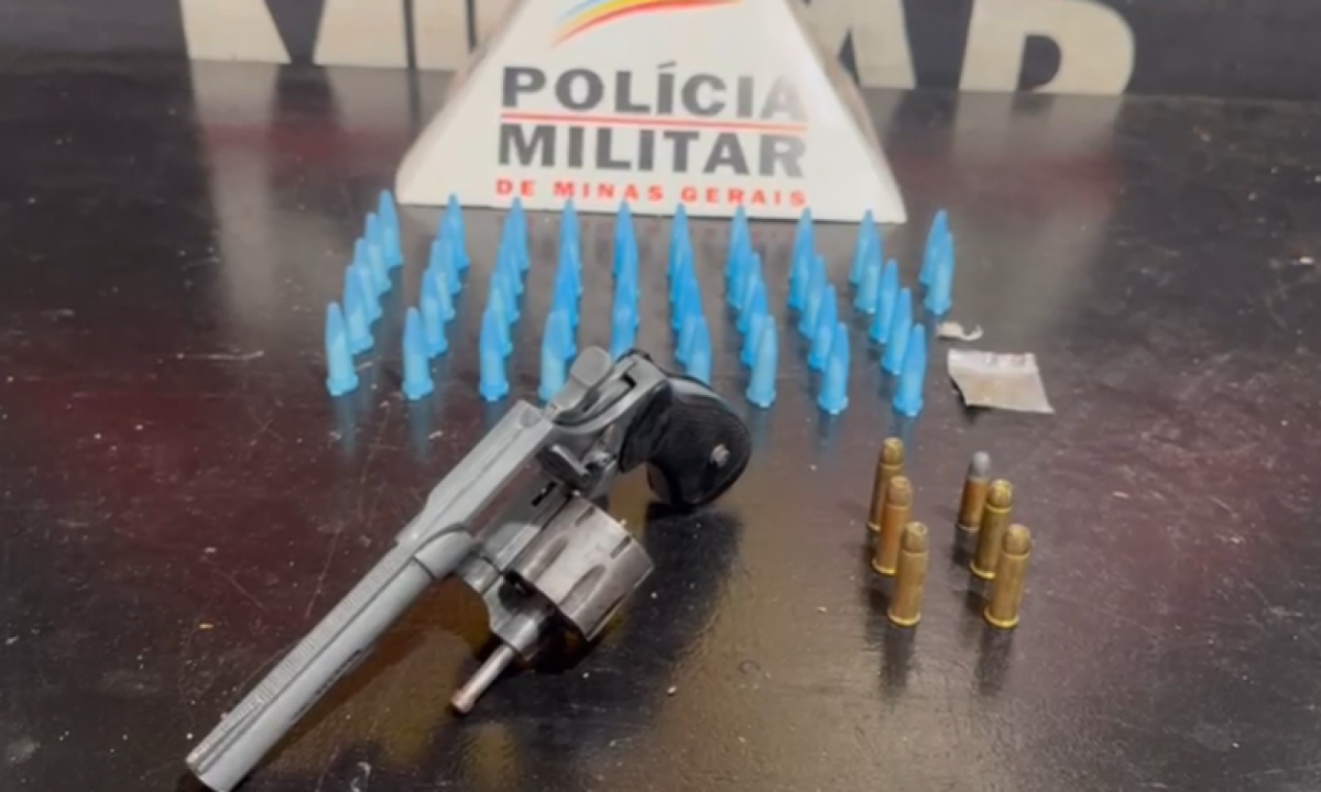 Durante a abordagem, os policiais apreenderam um revólver calibre .32, seis munições, 47 pinos de cocaína, uma pedra de crack e uma bucha de maconha.