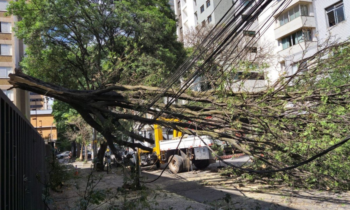 Os bombeiros informaram que foram acionados para a ocorrência às 20h35 de ontem, depois que uma árvore de grande porte caiu e arrebentou a fiação elétrica. Parte da copa ficou entrelaçada e apoiada de forma suspensa em direção à fachada de um edifício, com risco de queda em cima da garagem do imóvel. Um carro foi atingido, sem vítimas, e foi retirado do local pelo próprio dono. A Companhia de Energia Elétrica de Minas Gerais (Cemig) foi acionada para realizar a desenergização e reparo da rede.