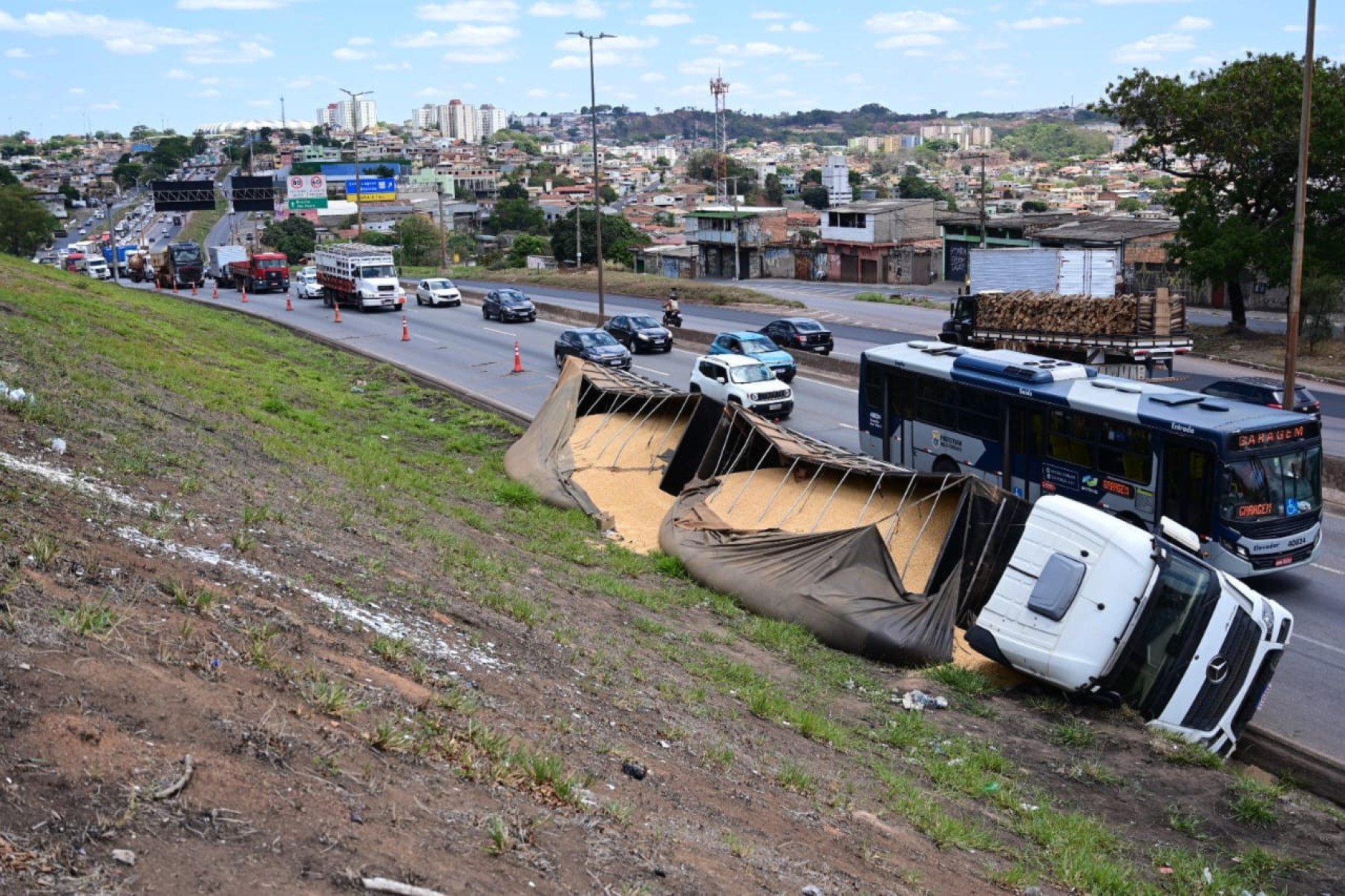 Uma carreta carregada de milho tombou na noite dessa segunda-feira (20/10) no Anel Rodoviário, nas proximidades da Praça São Vicente, em Belo Horizonte (MG).