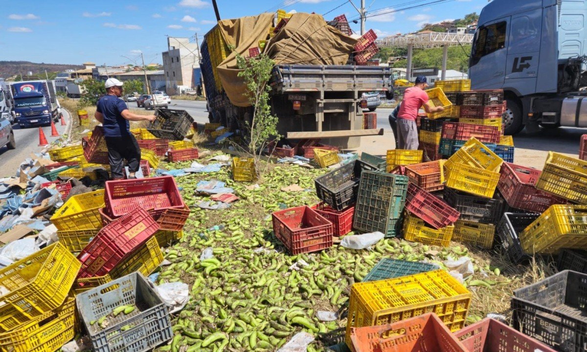 Uma carreta carregada de bananas tombou e interditou, na manhã desta terça-feira (21/10), um trecho da Via Expressa, em Contagem (MG), na Região Metropolitana de Belo Horizonte.