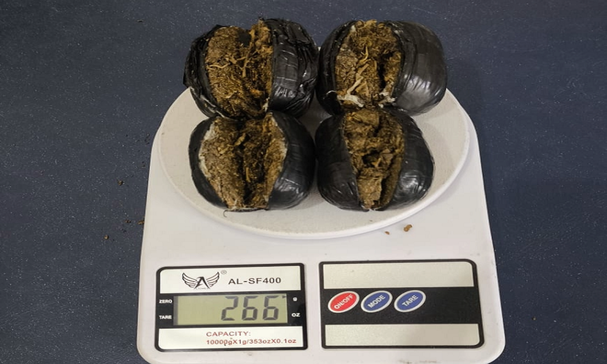 O visitante, ao ser questionado, confessou que portava maconha, que estava colada em seu corpo. Ele entregou os quatro invólucros contendo 266 gramas de maconha, e dois maços de papel de seda, num total de 66 unidades.