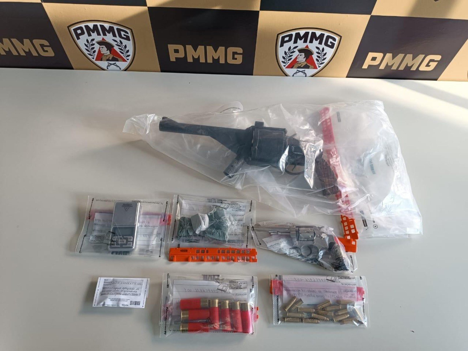 Em outro cômodo da residência, foram localizados quatro tabletes de maconha, uma balança de precisão, 14 munições calibre .38, um cartucho calibre 12 e um revólver calibre .32, que estava desmuniciado e escondido sob roupas.