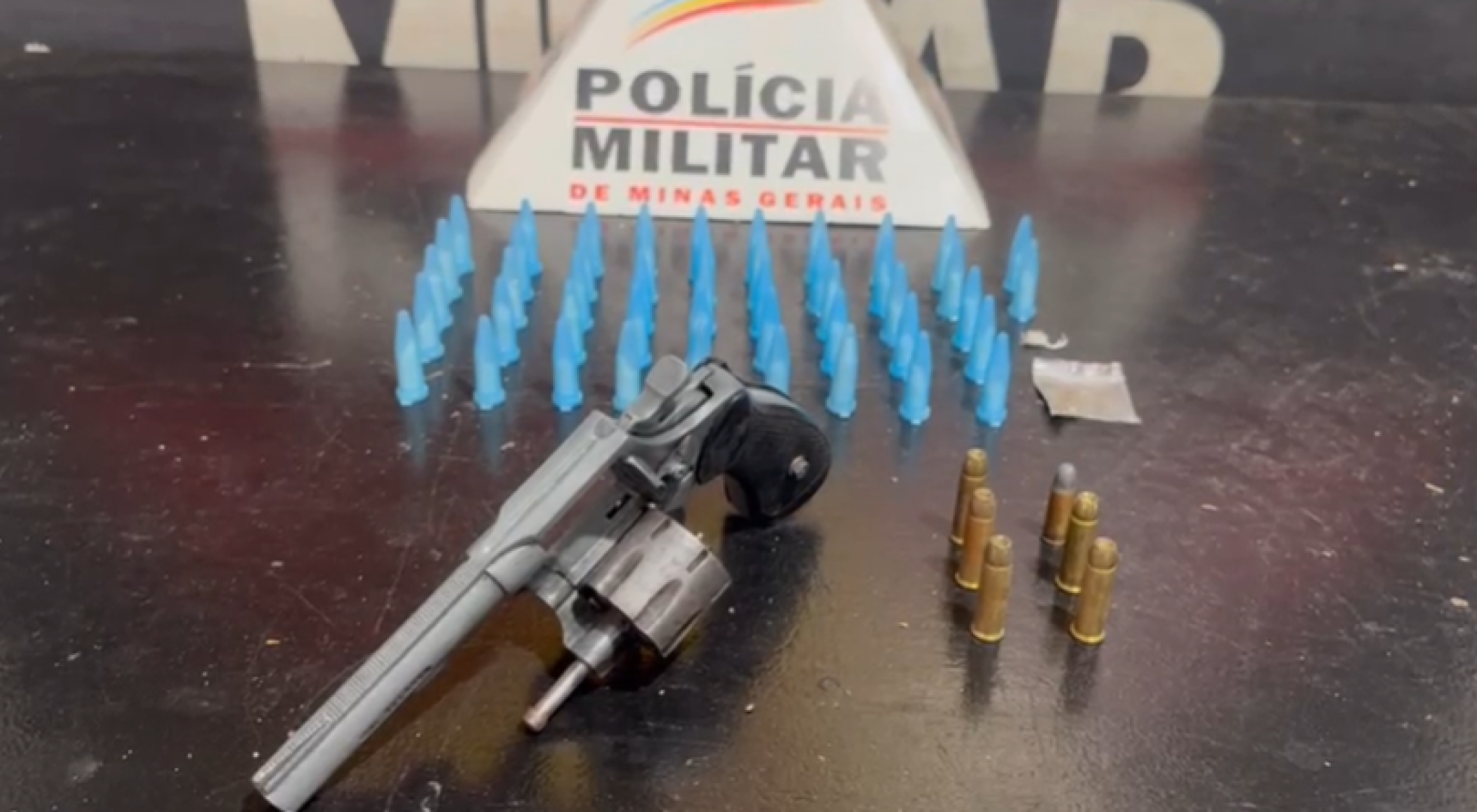 Durante a abordagem, os policiais apreenderam um revólver calibre .32, seis munições, 47 pinos de cocaína, uma pedra de crack e uma bucha de maconha.