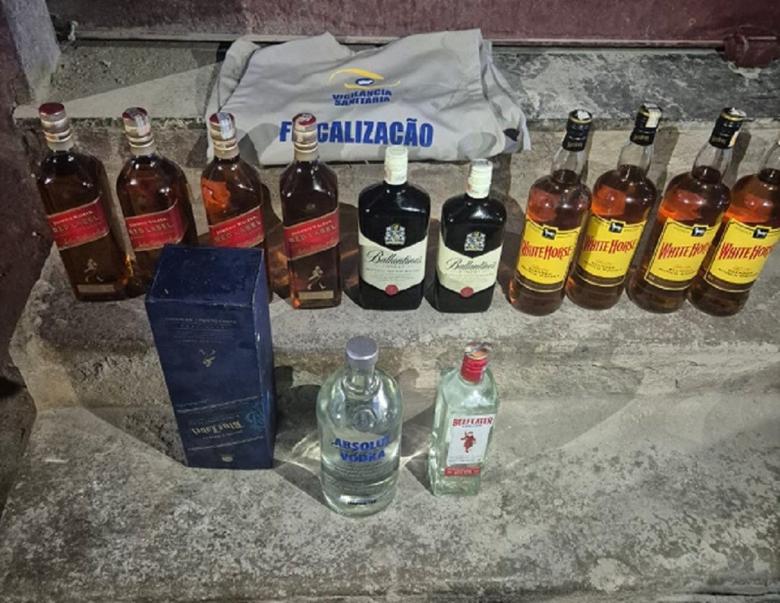 Havia grande quantidade de bebidas alcoólicas falsificadas, além de materiais e instrumentos utilizados para adulteração, tais como garrafas vazias, tampas, rótulos e lacres falsificados.