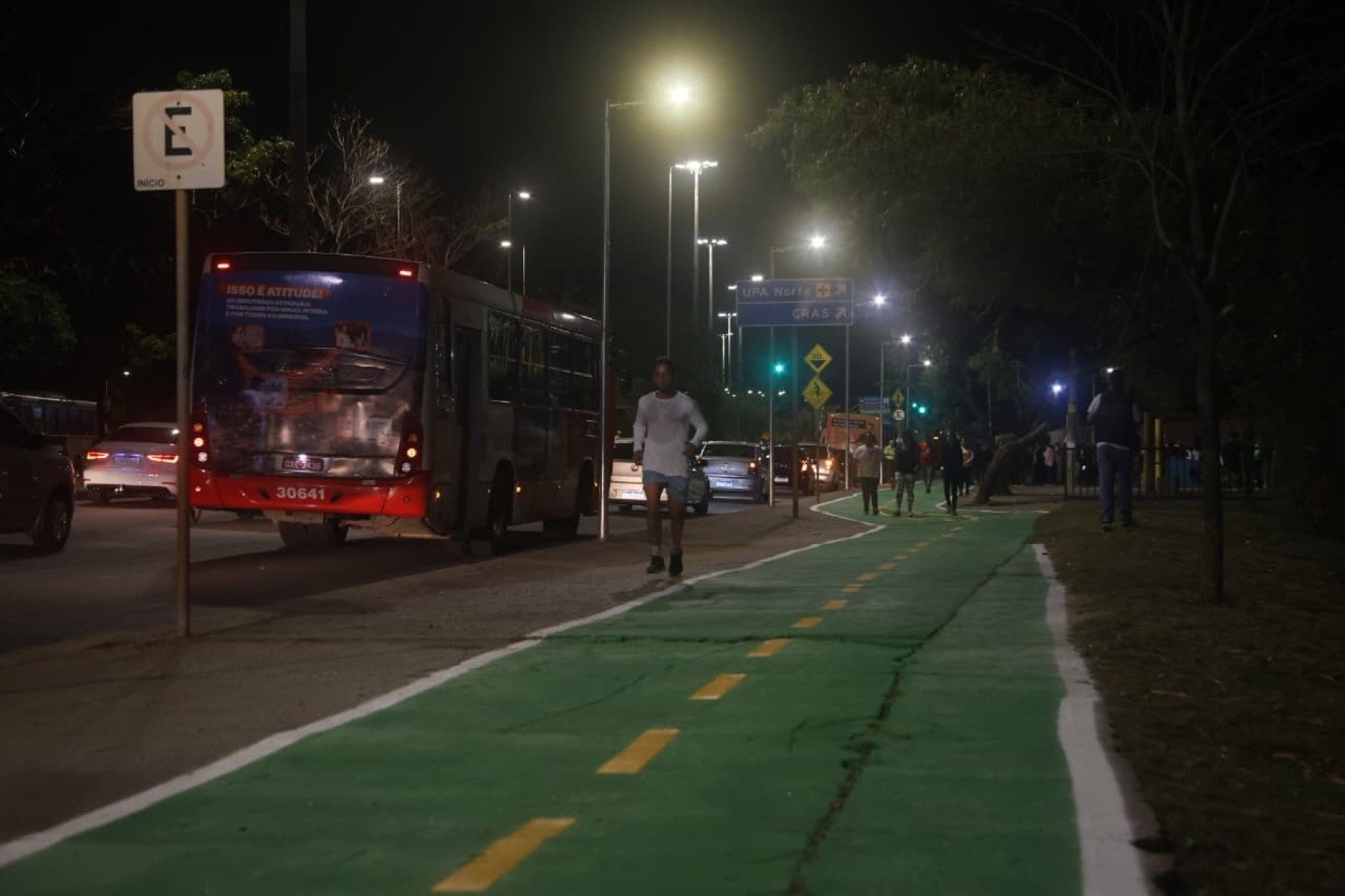 Esse é o caso da Avenida Risoleta Neves, onde os postes instalados pelo programa acompanham a calçada e a ciclovia. As luminárias ficam posicionadas em postes mais baixos e independentes daqueles que iluminam as faixas de rolamento da via. "A gente vai ter, a partir de agora, iluminação abaixo das copas das árvores", destacou o prefeito.