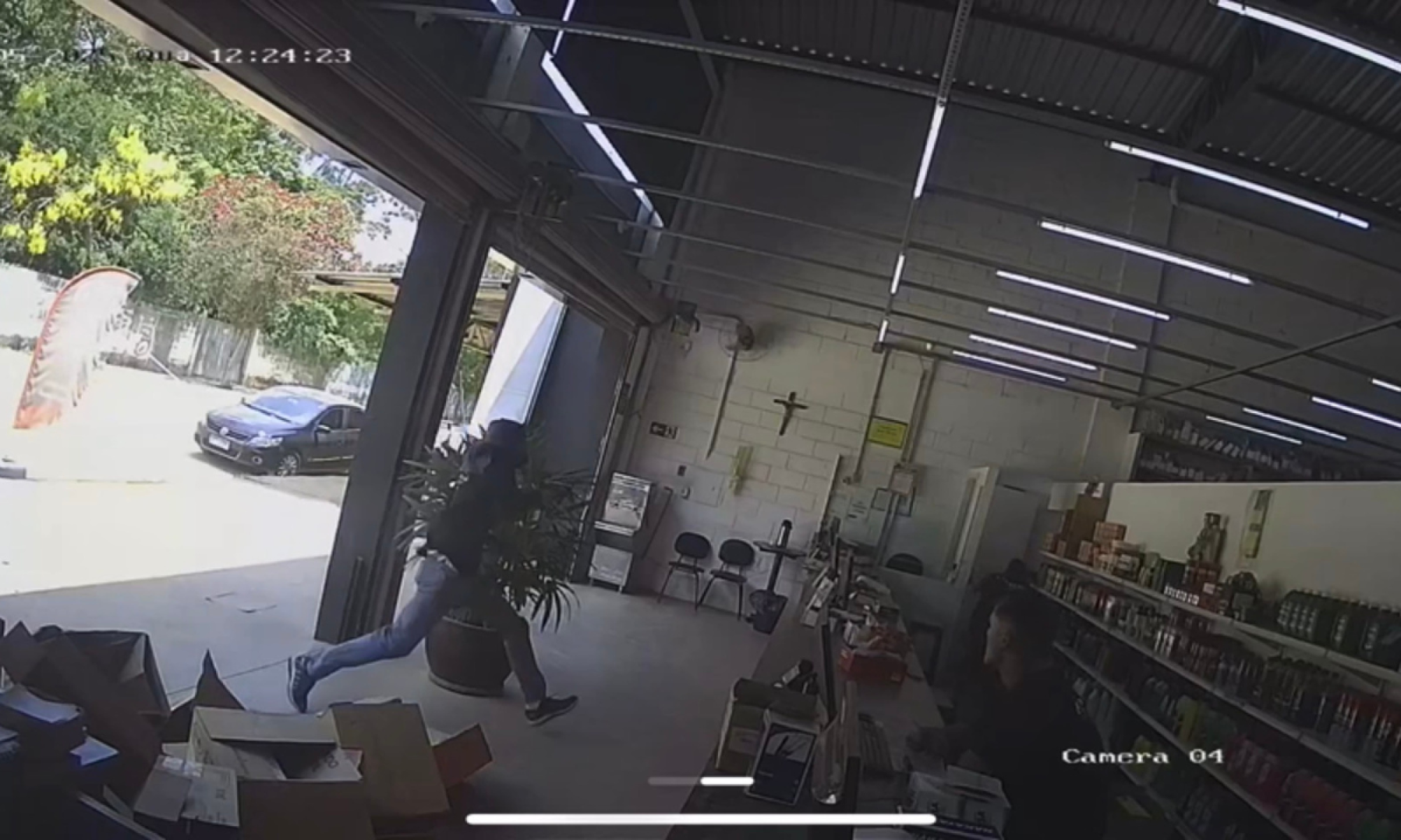 Câmeras de segurança registraram toda a ação do criminoso. Pessoas que estavam no local correram para se esconder.