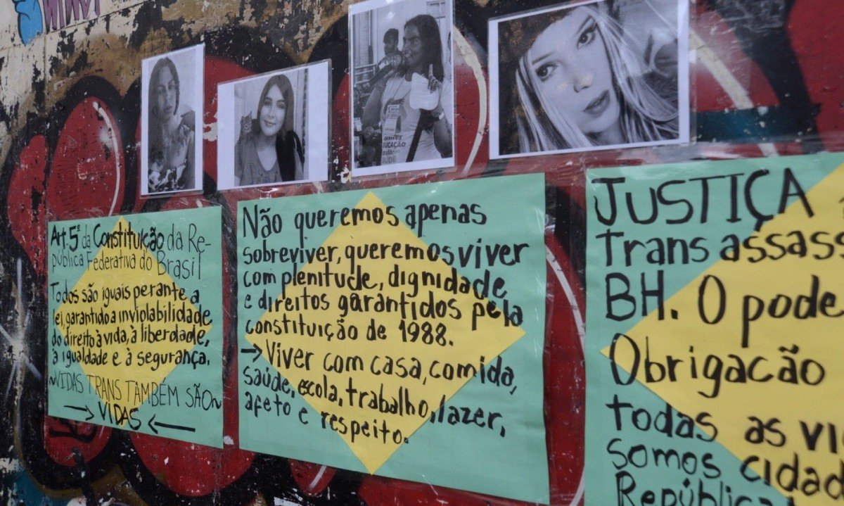 Em cartazes afixados na Praça Sete, no Centro de BH, manifestantes reivindicam a garantia dos direitos de pessoas trans, assim como justiça para aquelas que foram vítimas de homicídio, como Alice Martins Alves, de 33 anos. Mulher trans, ela foi agredida no dia 23 de outubro, e morreu por complicações dos ferimentos sofridos no dia 9 de novembro. Os dois principais suspeitos de cometerem o crime contra Alice foram identificados pela Polícia Civil de Minas Gerais, mas ainda não foram presos.