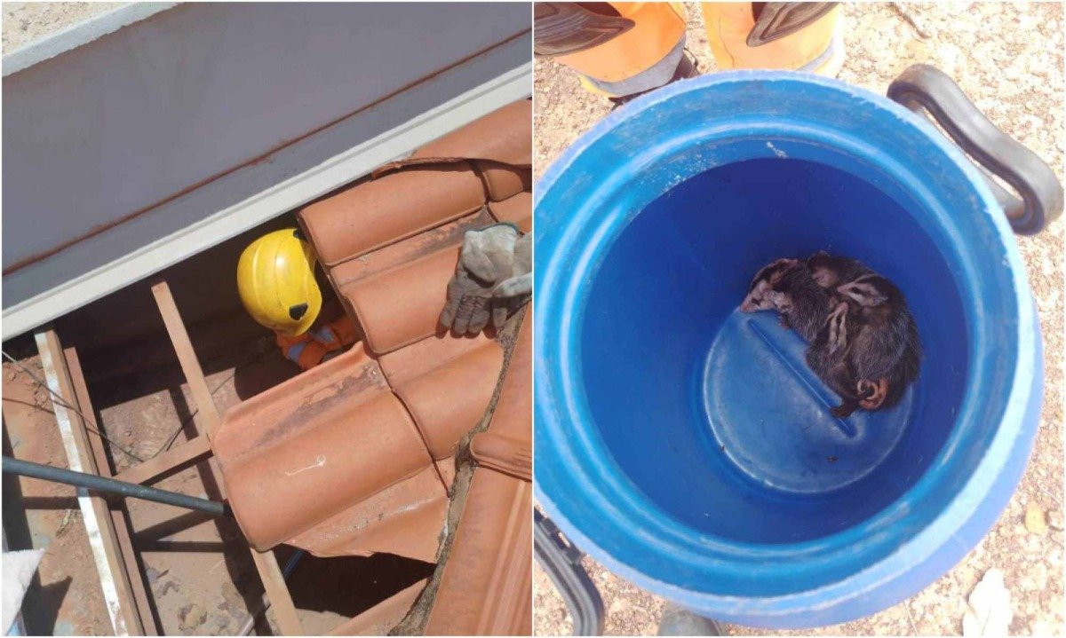 Ao chegarem ao local, os militares encontraram um gambá-de-orelha-preta — conhecido popularmente como saruê — acompanhado de cinco filhotes vivendo no telhado da garagem do morador que fez a solicitação.
