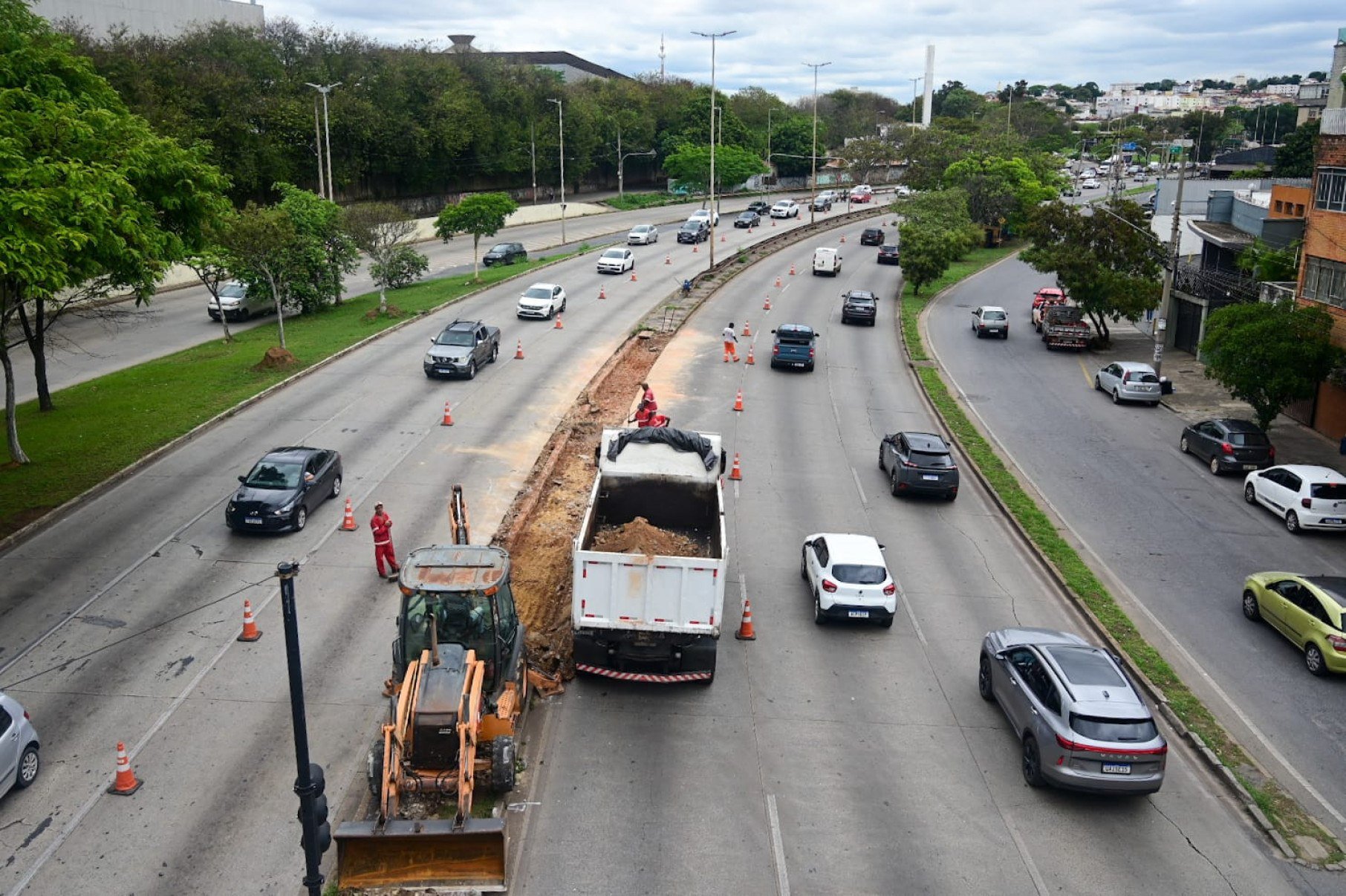 Quem passou pela Avenida Presidente Juscelino Kubitschek (Via Expressa), na altura do Bairro Coração Eucarístico, na Região Noroeste de Belo Horizonte, nesta segunda-feira (10/11), se deparou com trabalhadores da Prefeitura de BH (PBH) na pista, realizando obras no canteiro central.