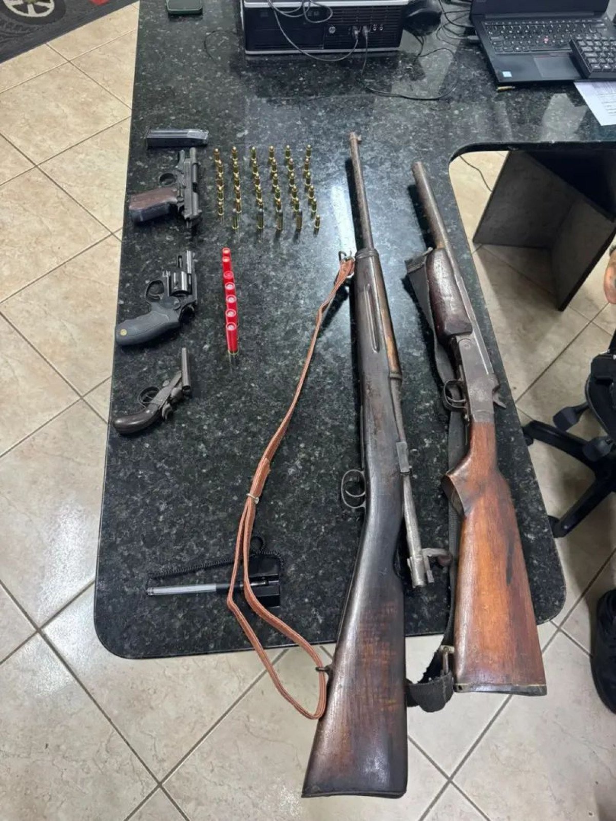 No local, foram realizadas buscas no interior do imóvel e encontrados uma pistola Taurus .765, um revólver Taurus .38, uma garrucha Rossi .32, um rifle calibre 36, um rifle artesanal calibre 19, um carregador PT 57 e mais de 30 munições de diversos calibres.