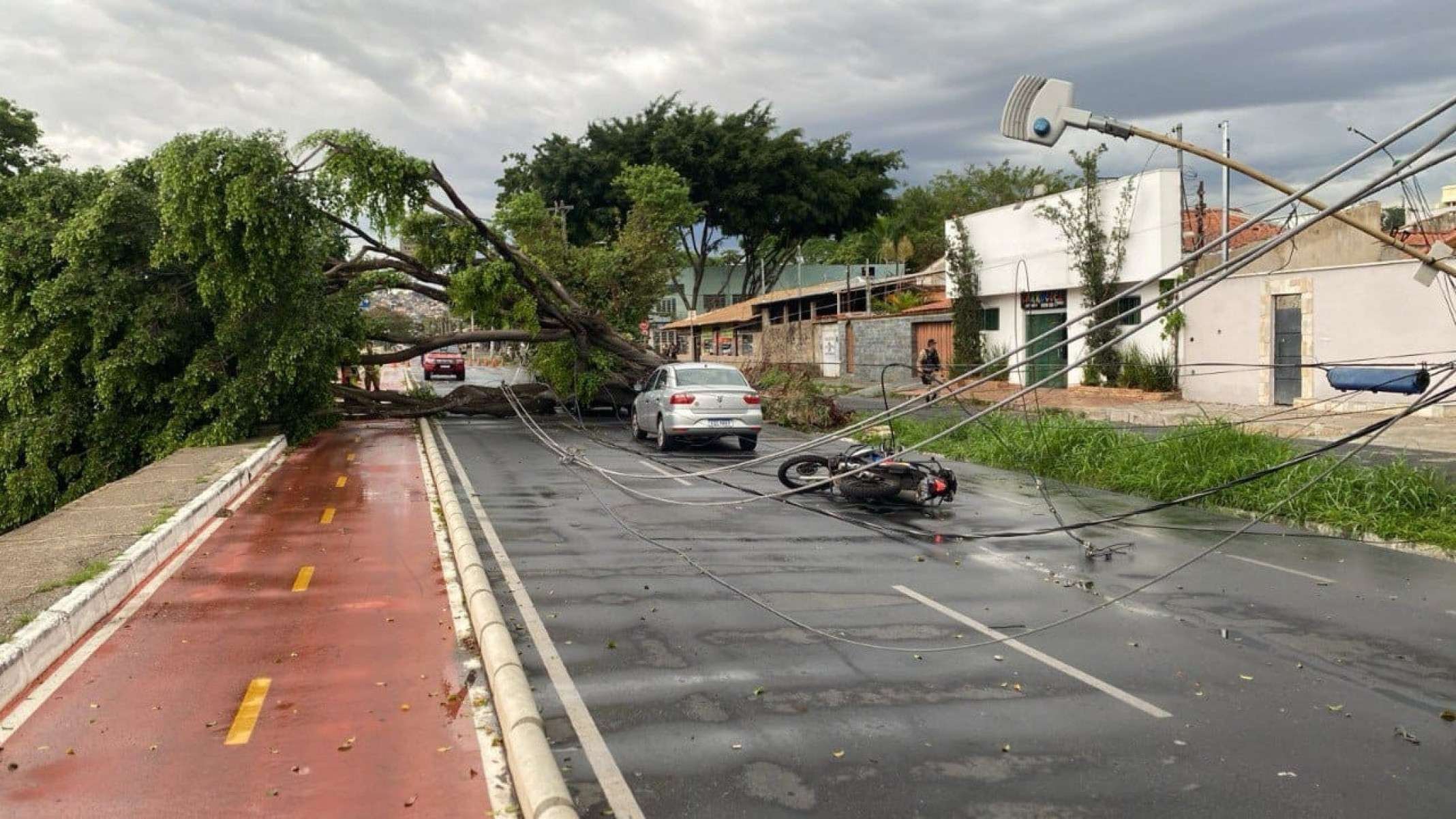Imagens mostram os dois sentidos da via, assim como a ciclovia, obstruídos pela árvore e pelos postes. É possível ver também a moto da Polícia Militar caída ao chão. A BHTrans informou que agentes atuam na ocorrência para controlar o trânsito e orientar os motoristas.
