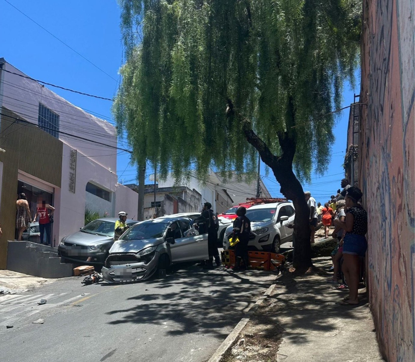 Segundo o Corpo de Bombeiros, depois do impacto entre os carros, um dos veículos atingiu o portão de uma casa, que caiu sobre uma moradora. Bombeiros, Samu e Polícia Militar foram acionados para atender a ocorrência.