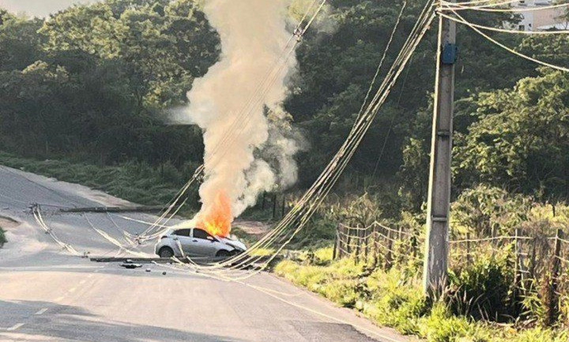 O acidente aconteceu no início da manhã desta quarta-feira (26/11), na Avenida Raimundo Diniz Lima, Bairro Pérola Negra. No momento da colisão, a fiação se partiu e ficou caída na via. O veículo foi incendiado, mas o condutor conseguiu sair do carro sem ferimentos.