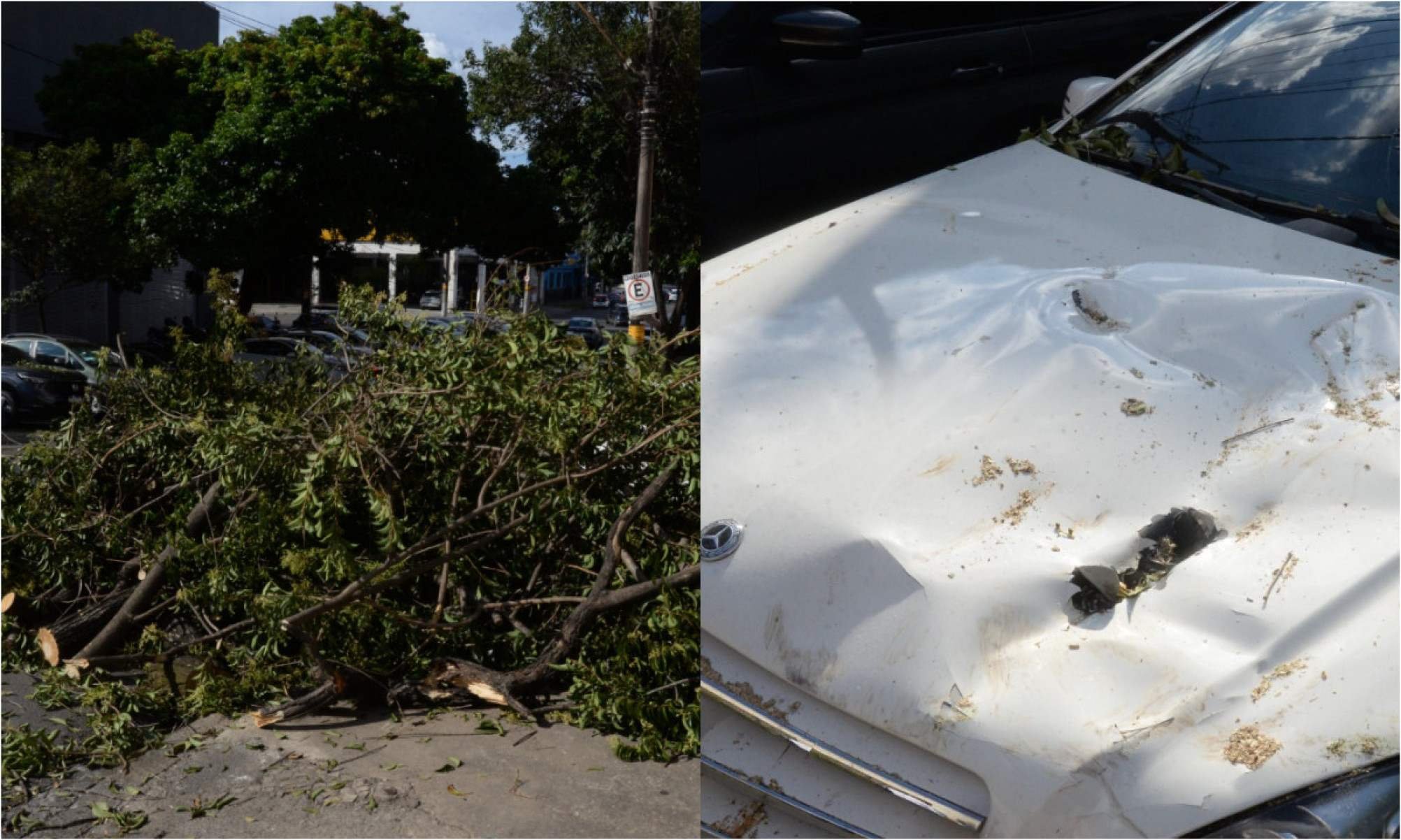 Uma árvore de médio porte caiu sobre um carro e interditou parte da Rua Uberaba, na altura do número 175, no Barro Preto, em Belo Horizonte, na tarde desta quarta-feira (26/11).